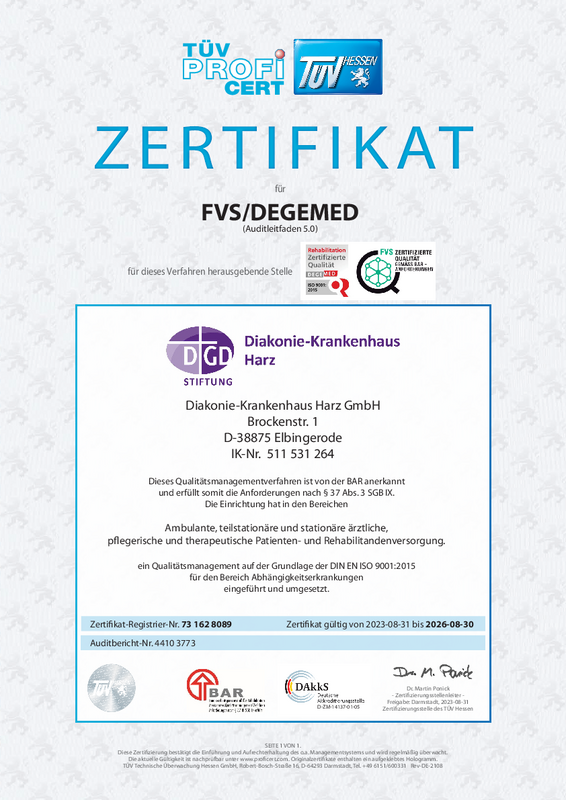 Seit 2016 ist das Diakonie-Krankenhaus Elbingerode nach DIN EN ISO 9001:2015 zertifiziert und erfüllt seither die Anforderungen an ein Qualitätsmanagementsystem nach einer internationalen Norm. Unsere Rehabilitationsklinik Sucht ist nach DEGEMED/Fachverband Sucht e.V. zertifiziert.